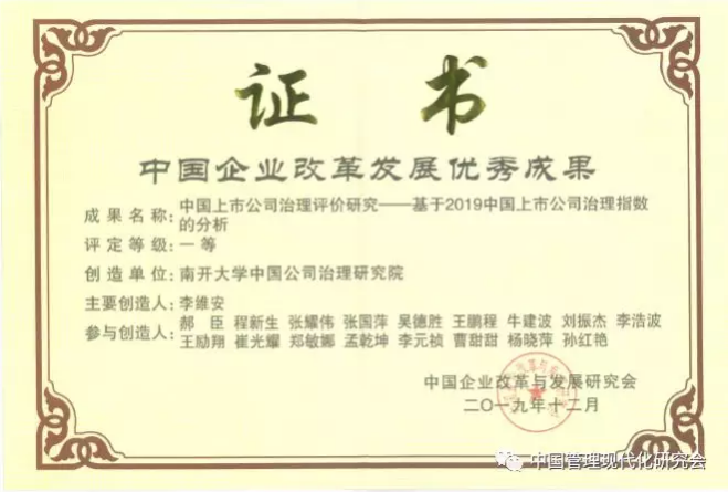 2019年12月16日上午,由中国企业改革与发展研究会主办的2019中国企业改革发展峰会暨成果发布会在北京举行,中国公司治理研究院李维安教授等主创的“中国上市公司治理评价研究——基于2019中国上市公司治理指数的分析”经专家审定委员会审定,获得一等奖。本届共有149项成果确定为“中国企业改革发展优秀成果”,其中一等奖69项,二等奖80项。