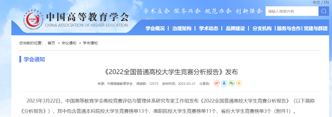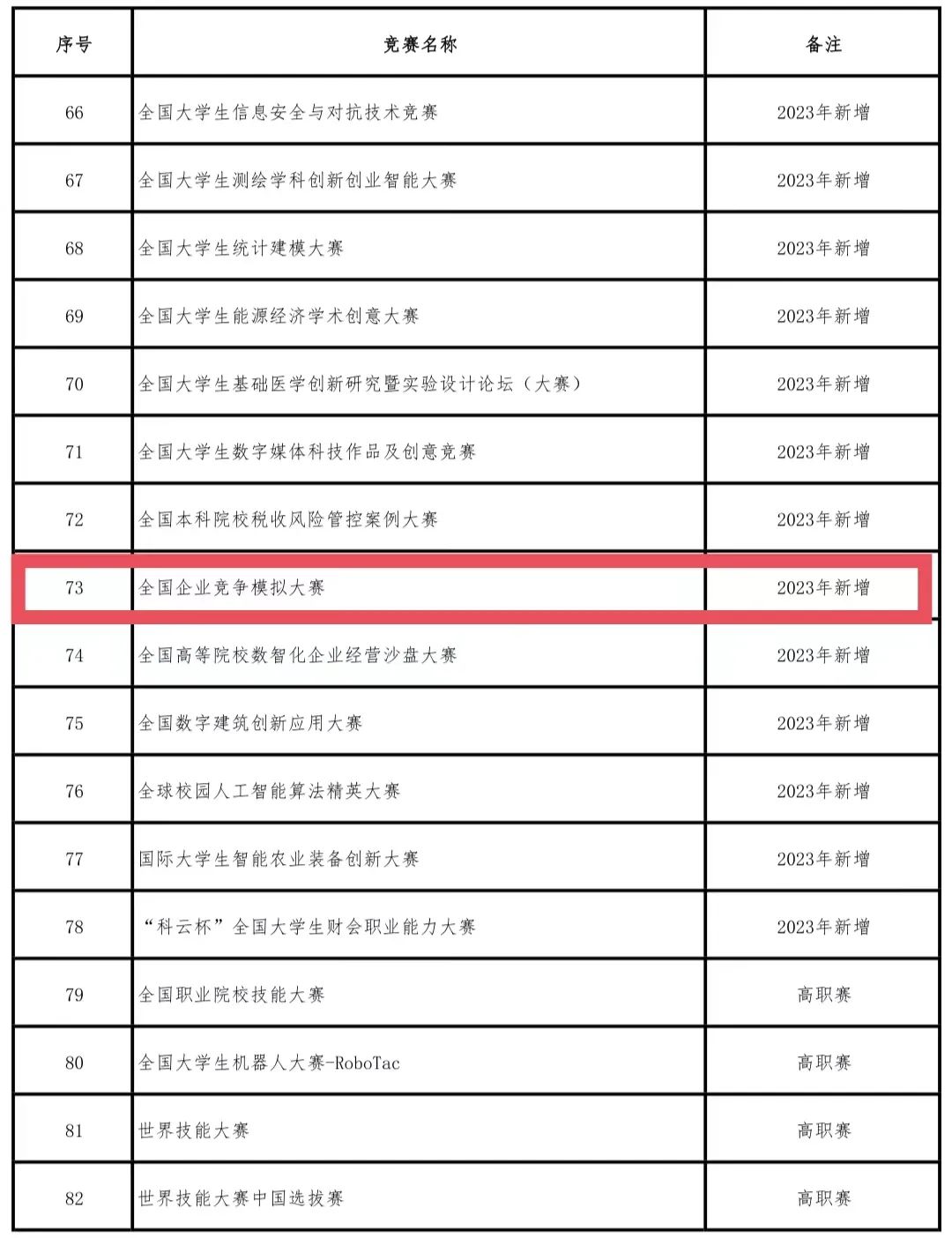 2023年3月22日,中国高等教育学会高校竞赛评估与管理体系研究专家工作组发布《2022全国普通高校大学生竞赛分析报告》,全国企业竞争模拟大赛新增列入《2023全国普通高校大学生竞赛分析报告》竞赛目录【赛项序号73】。详见中国高等教育学会官网: