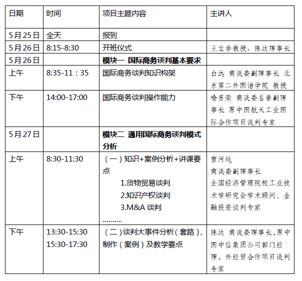 通过培训,使受训教师能够掌握国际商务谈判基础知识构架和操作原理,了解各类商务活动中国际商务知识与实际谈判如何结合与应用,学习如何组织国际商务谈判课程教学与安排,并对商务谈判实操有较大的感性认知;通过培训为任课教师开启一个教学与科研的重要领域。