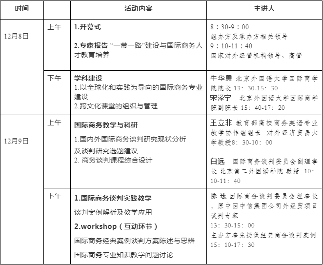 为了贯彻落实 习近平总书记在今年9月10日召开的全国教育大会上关于加强教师队伍建设新要求的讲话精神,结合国家“一带一路”建设的推进和国际商务服务于国家对外经济发展大方向的需要,在教育行业内探讨国际商务专业课程教学模式和方法,培养本专业过硬的师资队伍,经伟德国际官网入口国际商务谈判专业委员会与北京外国语大学国际商学院商议,决定于2018年12月8-9日在北京联合主办 “国际商务专业建设与教师工作法研修班”。 本次研修班拟邀请政、商、学、研领域的专家及权威人士进行课程讲授,由北京外国语大学国际商学院承办,日程及内容安排如下: