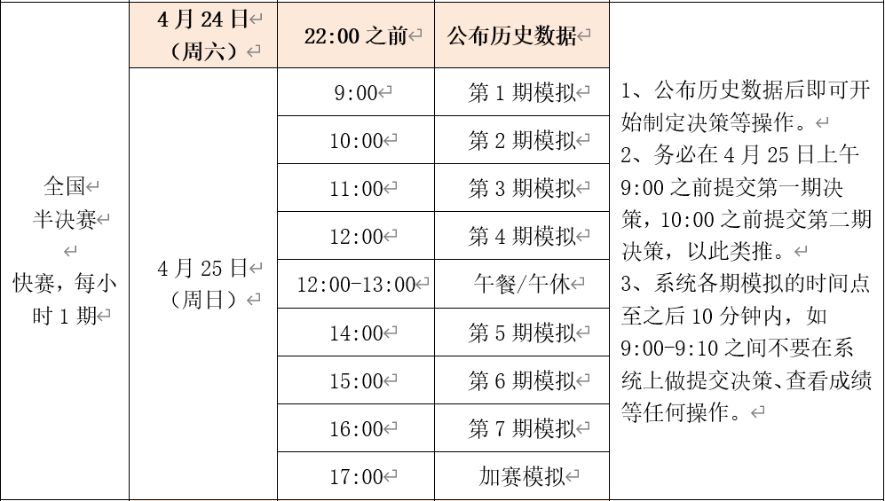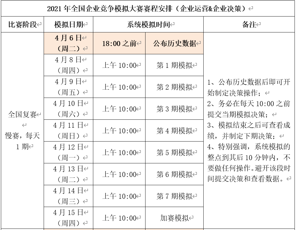 全国复赛将于2021年4月6日下午18:00之前公布历史数据,4月8日上午10:00进行第一期决策模拟。请合理规划安排参赛时间,按时提交决策。