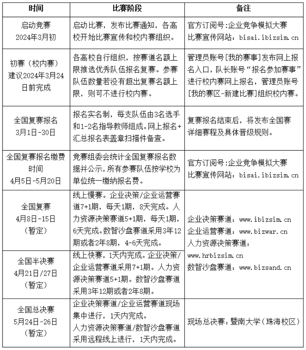 2024年全国企业竞争模拟大赛分校内初赛、全国复赛、全国半决赛、全国总决赛,具体赛程安排如下: