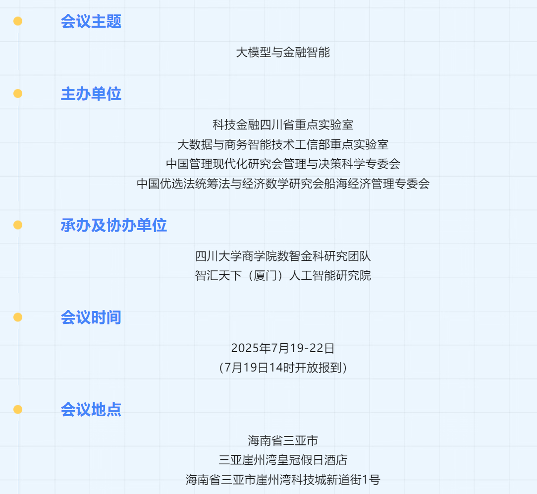 从ChatGPT的爆火到令人惊叹的Sora和DeepSeek,人工智能给人类社会带来一次次冲击。在科学技术发展日新月异的今天,人工智能和大数据技术正在深刻地改变着金融行业的运营管理和商业模式,为金融行业带来了前所未有的机遇和挑战。为深入探讨数据智能与金融科技的最新发展,四川大学商学院数智金科研究团队已于2024年6月23-26日发起首届数据智能与金融科技学术研讨会。在上年基础上,经商议第二届数据智能与金融科技学术年会将于2025年7月19-22日在海南省三亚市举办。